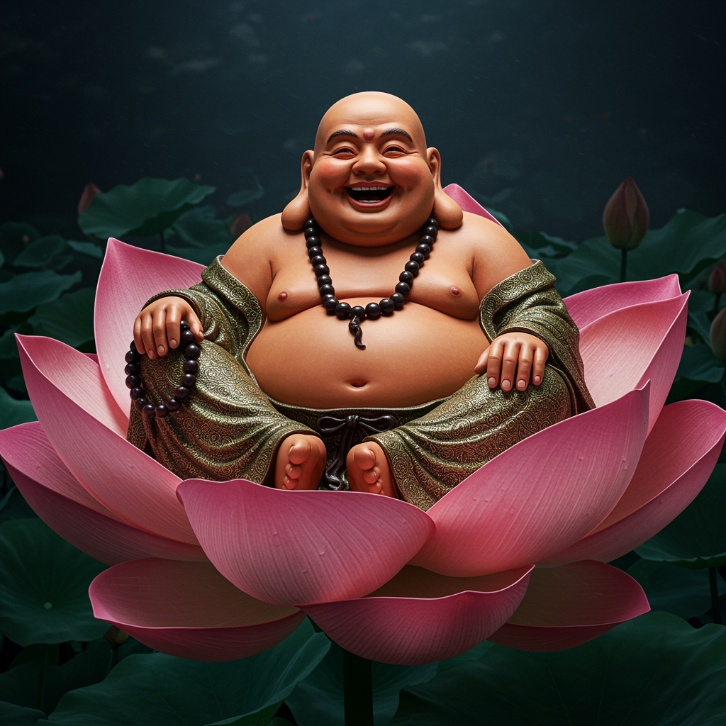 A jovial, rotund man resembling a laughing Buddha, seated on an enormous lotus blossom, his face hyper-realistic with detailed skindentation, bathed in dramatic cinematic lighting, exuding serenity and joy, a beautiful photorealism masterpiece with vibrant colors and intricate textures, capturing the essence of tranquility and wisdom amidst the delicate petals.