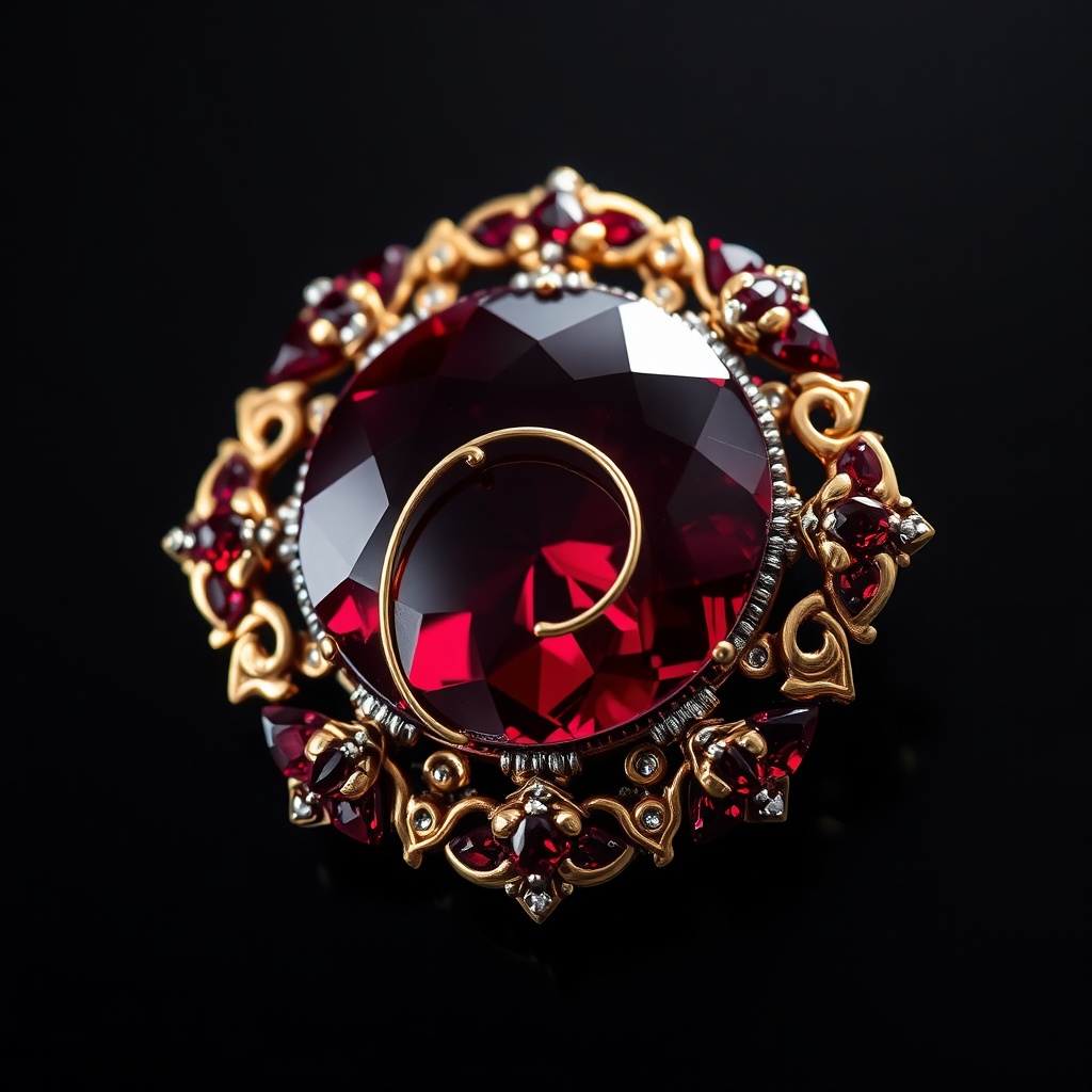 A radiant ruby brooch, shimmering with the hues of deep crimson, serves as a coveted game artifact, intricately designed with golden Art Deco motifs. Silver embellishments trace winding patterns across its circular face, casting a captivating contrast against its dark fantasy allure.