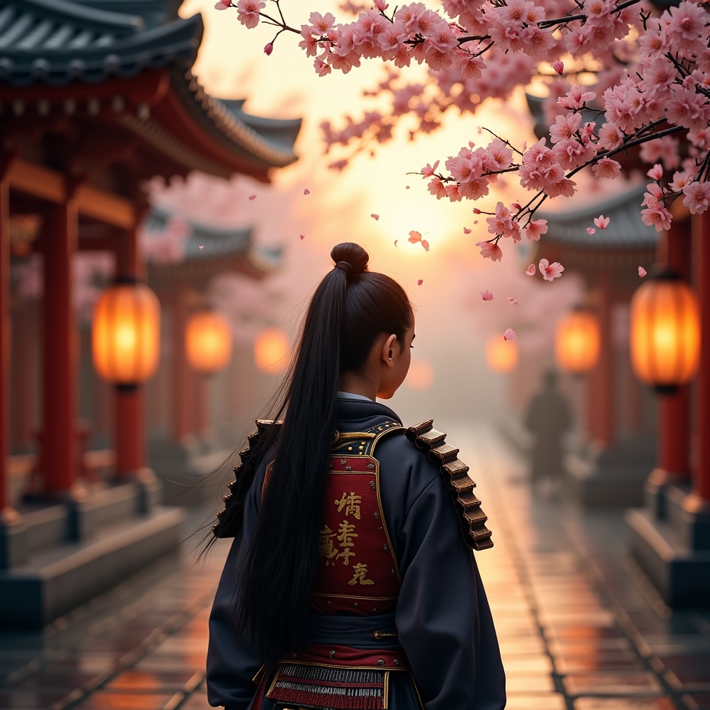 A young samurai with long, flowing black hair styled in a ponytail stands confidently in a serene Japanese temple. His intricate samurai armor gleams softly under a canopy of cherry blossoms, their delicate petals cascading gently in the air. Lanterns glow warmly, casting a tranquil yet ethereal light across the scene as the first rays of sunrise begin to peek over the horizon. The atmosphere is filled with a sense of peace and dramatic elegance, as delicate shadows dance and fuse with the rich textures surrounding him. The photo, captured with an ultra-high-resolution 8K camera and an f1.6 lens, pops with hyper-realistic details and vibrant colors, embodying a stunning blend of hyperrealism and cinematic beauty. Enveloped in lifelike texture, this moment immortalizes the harmony of nature and the stoic strength of the samurai, forming a captivating and enchanting visual narrative.