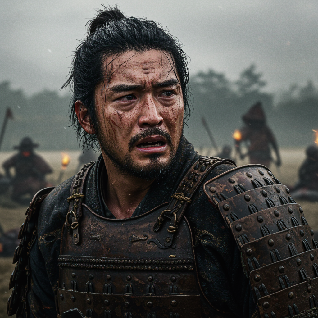 A battle-worn samurai gazes at the vanquished foes, standing amidst the aftermath with a visage marked by fear and anguish, his expression a blend of exhaustion and resolve. His face, streaked with sand and sweat, reflects the brutality of the conflict. The surrounding atmosphere is thick with an oppressive gloom, evoking a sense of encroaching dread. The hyper-realistic scene captures the intricate details of his tattered armor, each scratch and dent a testament to the ferocity of his struggles. In the background, flickering shadows dance over a landscape shrouded in an eerie, somber twilight, accentuating the sense of desolation and profound silence that follows such fierce encounters.