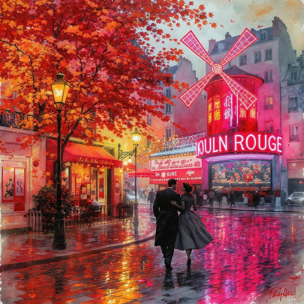 A captivating scene capturing the essence of 1950s Paris, where lovers stroll down cobblestone streets near the iconic Moulin Rouge. The atmosphere is alive with watercolor strokes reminiscent of Mark League's style, blending skillful composition and rough texture. The cityscape is bathed in the warm hues of Autumn as early evening sets in, with the soft glow of pink champagne lights reflecting off the wet pavements. The scene paints a romantic moment, enveloping the viewer in the timeless allure of Parisian charm.