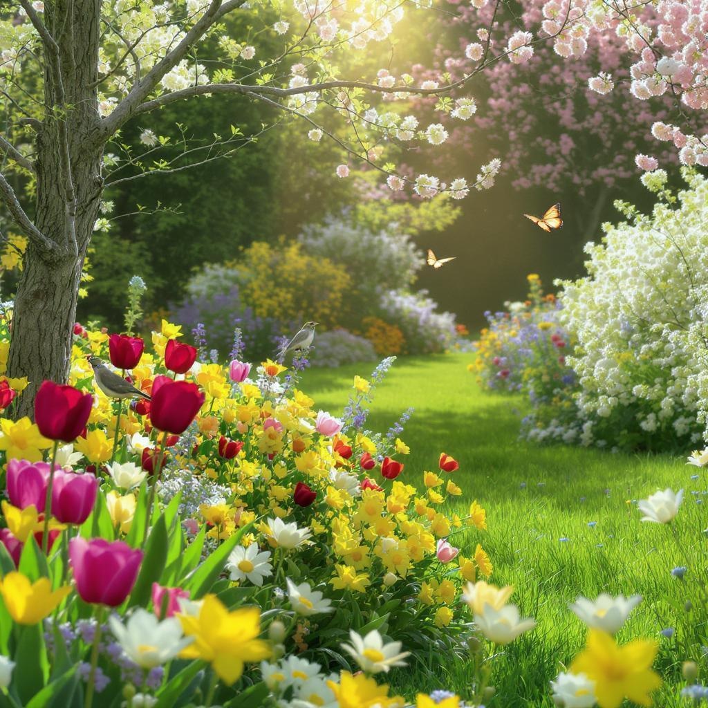 A vibrant scene of springtime joy, capturing the essence of new beginnings and blooming beauty, featuring a lush garden filled with colorful flowers and playful wildlife, with the gentle warmth of the sun creating a serene and inviting atmosphere, evoking feelings of pure happiness and rejuvenation.