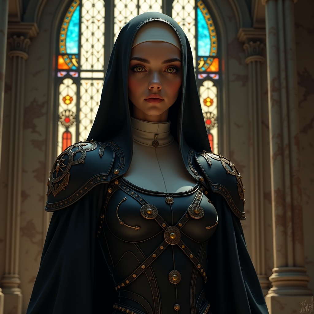 View this AI-generated image featuring a captivating scene reveals a devout sister of battle in a stunning full body portrait set in motion in front of a grand stained glass window her striking symmetrical face is detailed featuring reflective eyes dark eyebrows and subtle makeup she dons sci fi nun