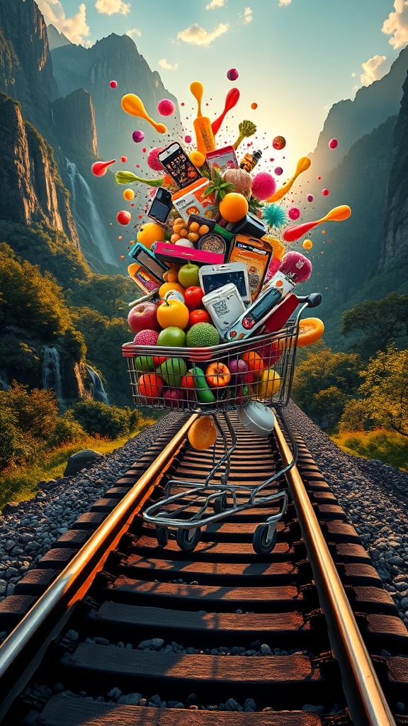 A surreal and vibrant scene unfolds on a dramatic railway track slicing through a picturesque mountainous landscape adorned with lush greenery and cascading waterfalls. At the heart of this dynamic composition is a lone shopping cart, perched confidently on the rails. It overflows with a kaleidoscope of colorful objects, symbolizing the excesses of e-commerce. Inside the cart swirls an explosion of fresh fruits, vegetables, electronic gadgets, and household items, intertwined with whimsical bursts of bright, paint-like textures. These elements dramatically spiral upwards, creating a fantastical trail that extends skyward. The setting sun casts the landscape in a warm, golden hue, creating elongated shadows and enhancing the scene's visual drama. This hyper-realistic image meticulously captures the textures and materials of each item, reflecting light and shadows to amplify its kinetic energy. With high saturation and a surrealistic approach, the artwork embodies an overwhelming vibrancy, captivating the viewer with its modern fantasy and commercial opulence. Elements are arranged dynamically, ensuring a dizzying array of floating products that defy gravity, composing a visual spectacle that frames the surreal beauty of excess against a breathtaking natural backdrop.