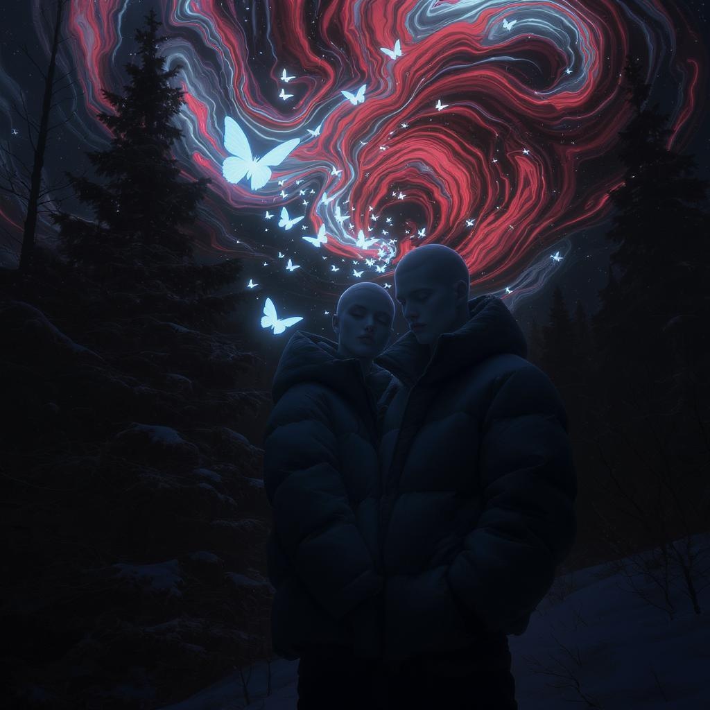 A dimly-lit scene of snowy winter puffer jacket fashion at night, with a surreal sky swirling with change and wind, dominated by deep red and blue hues. Luminescent butterflies float gently, casting a soft glow throughout a shadowy forest. The minimalist beauty captures androgynous figures wrapped in light black attire, the atmosphere resonating with a cosmopolitan vibe. Serene, calm faces are framed by loose and fluid silhouettes, merging with ethereal abstractions against a cold, muted palette. The air is filled with the energy of chaos, yet the setting retains an elegant sense of balance and tranquility.