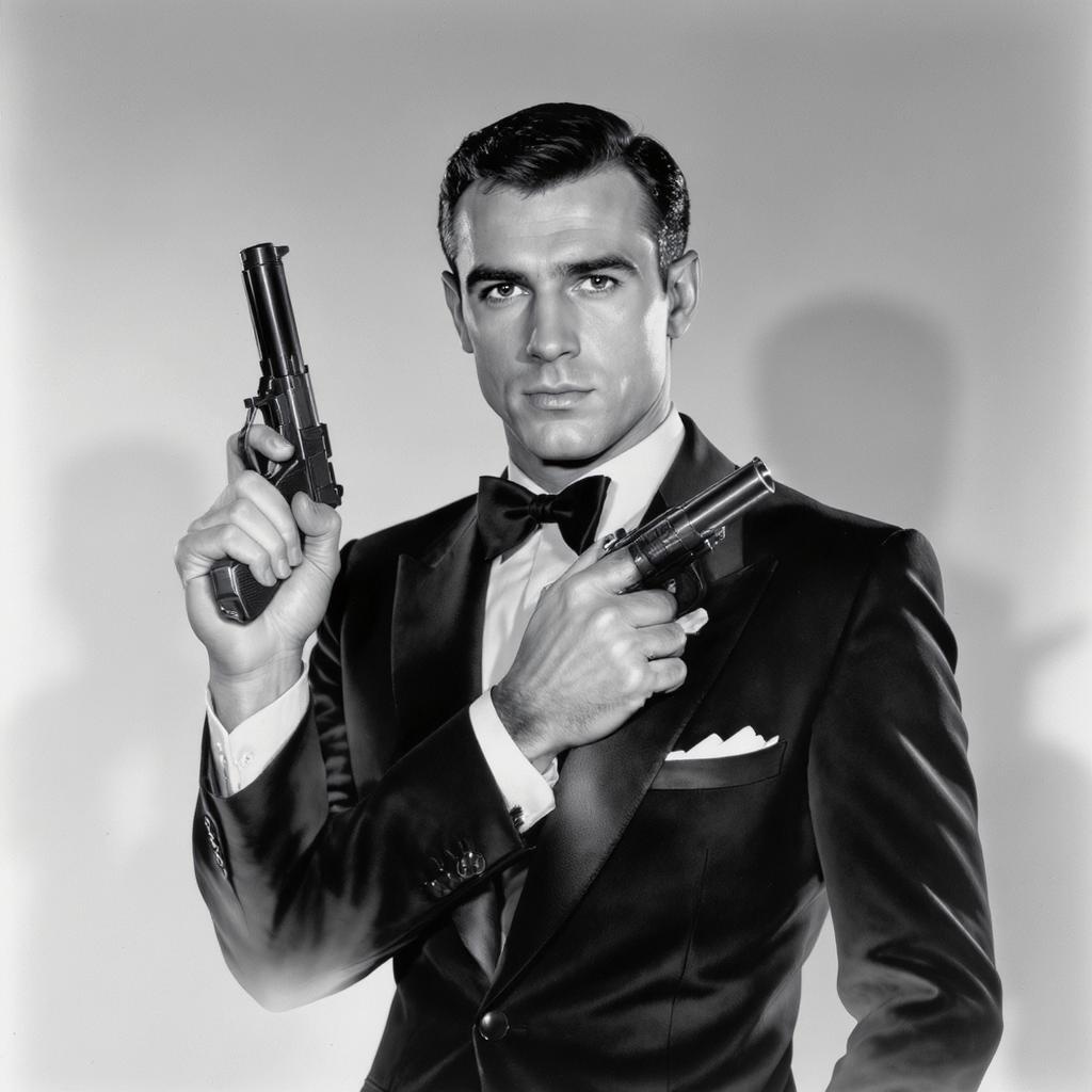 A young Sean Connery at 31, posed confidently with a gun, captured in an evocative black and white shot, blending elements of celebrity allure and iconic pop culture references, with a touch of mystery in his shiny, expressive eyes.