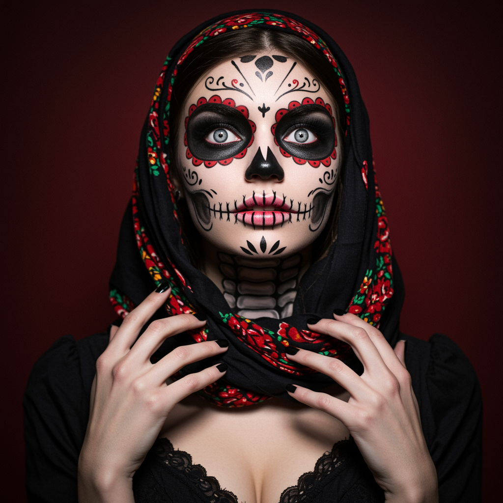View this AI-generated image featuring seductive portrait featuring a head scarf inspired by d a de los muertos with gothic elements portraying a cloned face with cross eyed features the imagery includes a long neck and extra fingers resulting in mutated hands the style is characterized by elements