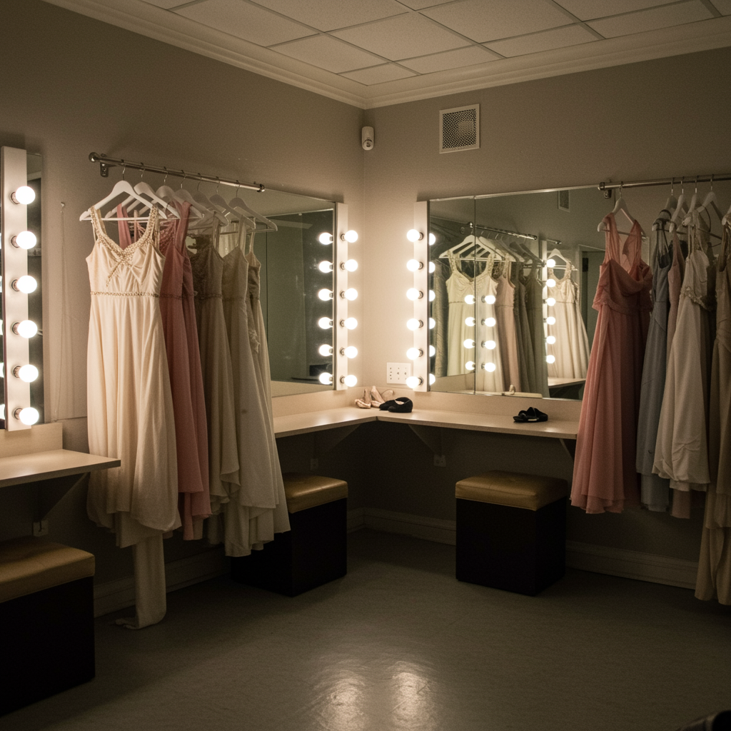 Serene and quiet dressing room with an array of elegant costumes hanging neatly, soft lighting casting gentle shadows, mirrors reflecting the tranquil space, plush seating inviting a moment of solitude, a sense of anticipation in the air.