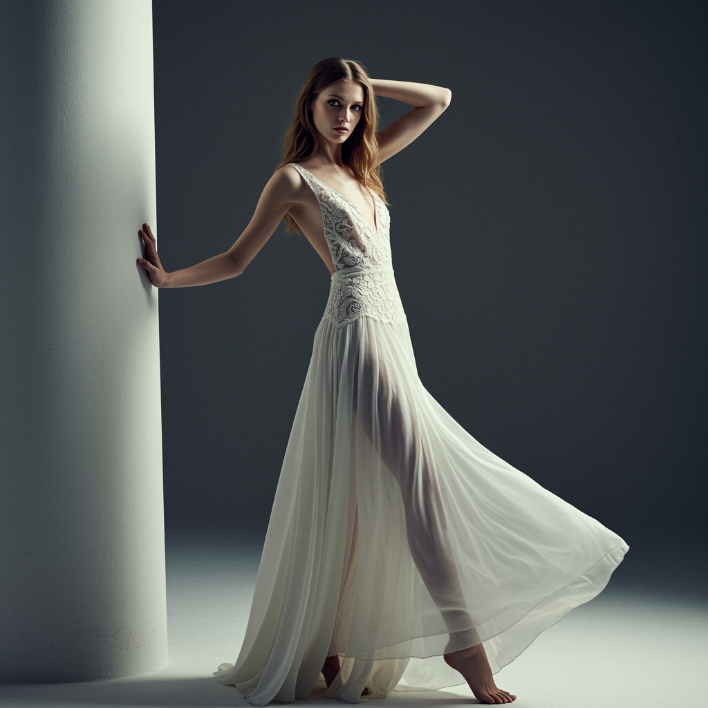 Serenity mood with a peaceful atmosphere, inspired by fashion photography in the style of Mario Testino, featuring a female model in a full-body shot. The design dress showcases ultralight shapes and textures, with an emphasis on detailed skin and captivating eyes. The model's incredible body composition adds elegance to the scene, pulling the viewer into a world of tranquil beauty, in a 2:3 aspect ratio with a softness rating of 750.