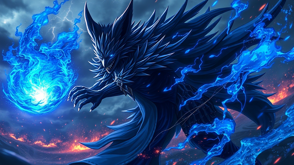 A formidable shadowy fox emits intense dark blue energy flames, depicted in anime style, 8K resolution. The enigmatic sorcerer with humanoid features, a male prince clad in darkness, dominates the battlefield. Around him, a tempest of blue infernal flames and sparks crackles across the scene. Against a backdrop of apocalypse, the artwork is vibrant, intricate, and elegant—a digital illustration captured with scenic and hyper-detailed perfection in 8K. Amidst the chaos, a dramatic thunderstorm rages, adding to the spectral and awe-inspiring atmosphere.