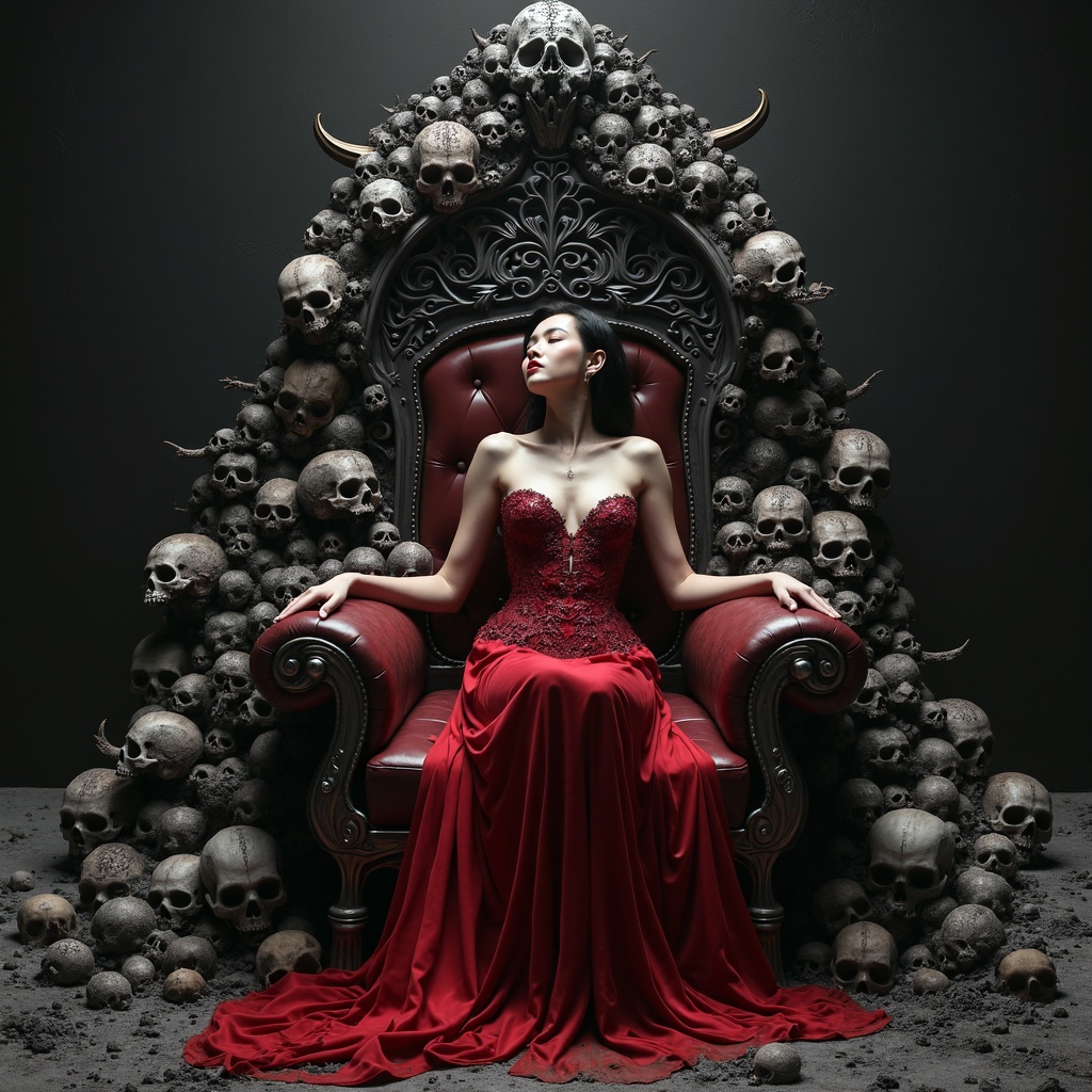 View this AI-generated image featuring she reclines gracefully upon a throne adorned with dark silver and deep crimson hues surrounded by a somber assembly of skulls her presence is an exquisite blend of magali villeneuve s intricate detailing and shilin huang s ethereal elegance set against a backd