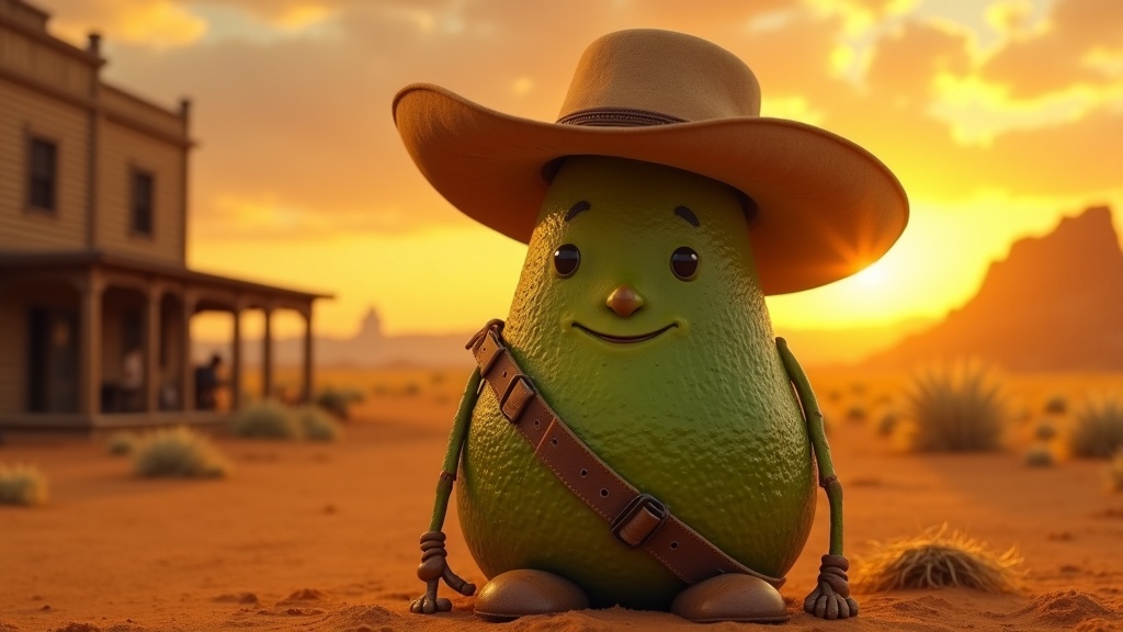 View this AI-generated image featuring a cinematic shot of a rugged desperado depicted as an anthropomorphic avocado set against a classic wild west landscape with dusty plains and a dramatic sunset the avocado desperado stands with a confident pose wearing a weathered cowboy hat tilted to the side