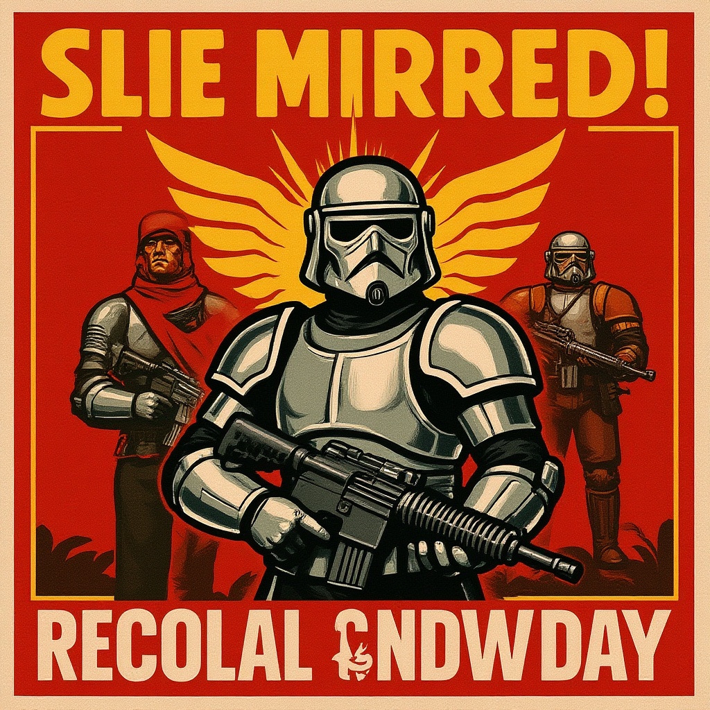 A Stormtrooper showcased in a Soviet-era-inspired propaganda recruitment poster, featuring bold colors and striking design elements, with a symbol incorporated into the background. The trooper stands proudly in full armor, accompanied by inspirational slogans that promote unity and strength. The retro style of the poster includes iconic imagery and delivers a powerful message, with a visually compelling and thought-provoking composition.