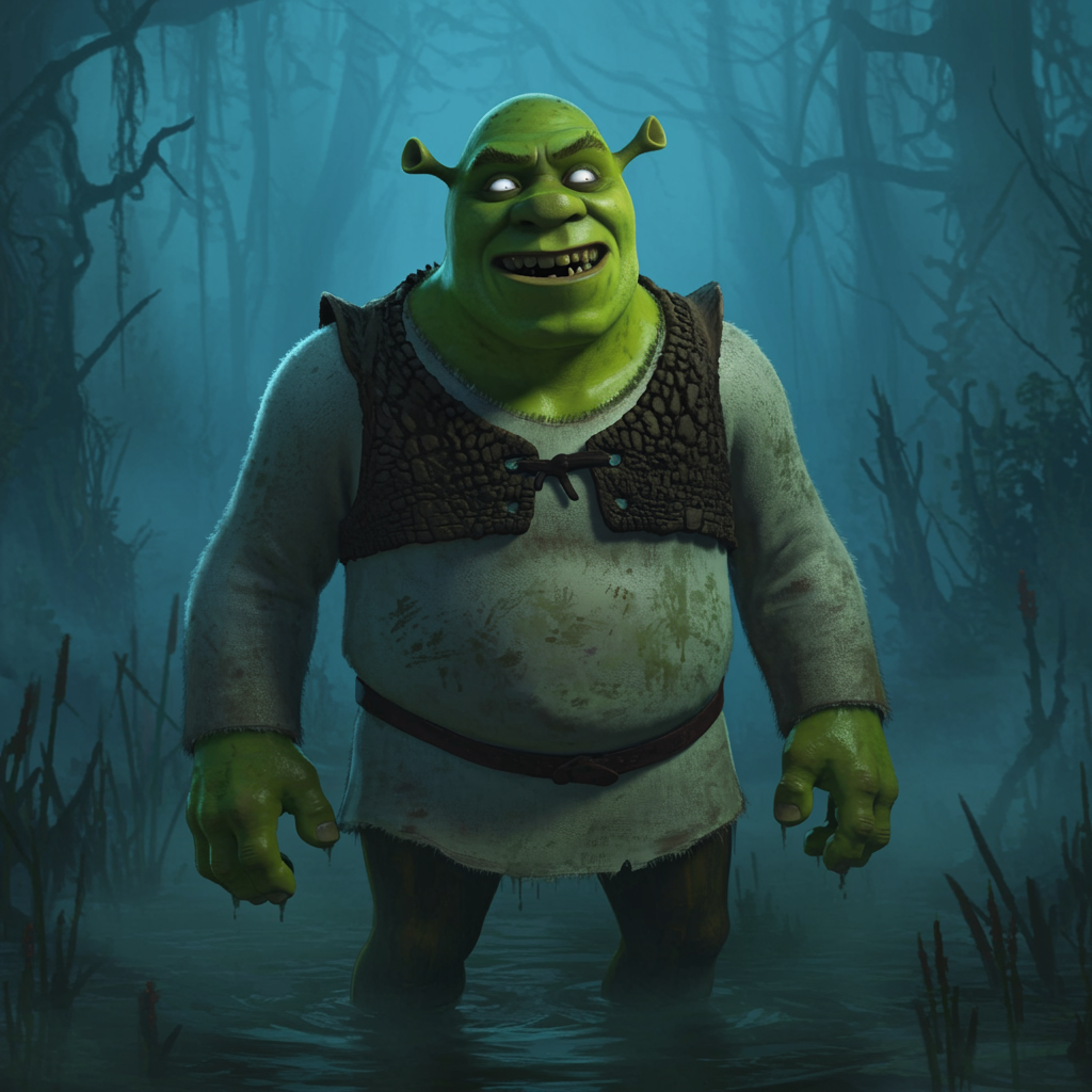 View this AI-generated image featuring a spectral and sinister shrek stands in a murky swamp his head tilted with glowing soulless eyes his green skin is slick with slime and smeared with traces of blood his form is partially obscured by mist and shadow his expression a haunting blend of agony and m