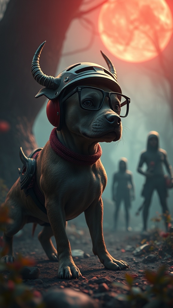 A world shrouded in stillness, where silent minds quest for clarity amidst nature's presence within us. A demon lurks, with a bloody aura enveloped in volumetric lighting and atmosphere, capturing attention like a trending piece on ArtStation. Rendered in 4k, the scene boasts vibrant, high-resolution quality reminiscent of Bastien Lecouffe-Deharme's work. In this surreal landscape, a dog dons glasses and a helmet, adding whimsy to the fantastical environment. Despite a watermark, and warped visions by a 'bad artist', figures with disfigured limbs, deformed features, and extra fingers emerge, their presence both grotesque and intriguing. Cartoonish 3D elements play with weird colors, while distorted faces and cloned visages blur into the background. Tiling textures add to the chaos, with mutated hands and feet displayed in bizarre proportions. Blurry and out-of-frame elements enhance the sense of otherworldliness, creating a video game-like reality where bad anatomy and disfigured forms reign supreme.