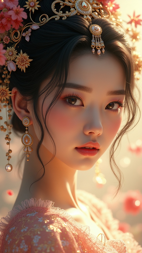 Single Korean girl, beautiful and elegant, featured in an extremely detailed CG illustration with intricate, ultra-detailed Korean traditional elements. The scene is artistic and fantastical, enhanced by cinematic lighting showcasing a stunning solo figure with a beautifully detailed face. She is adorned with glittering accessories that add sparkle to the composition. The background is abstract with art nouveau influences, contributing to a dynamic composition rendered in 8k UHD and HDR. The illustration captures a unified and harmonious appearance, avoiding any visual disturbances such as blurriness, artifacts, or intrusive elements like watermarks or text. The artwork presents a striking and cohesive portrayal without any deformities or superfluous distractions.