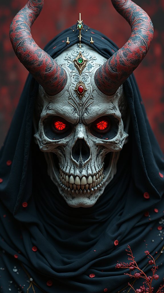 Skull demon sorcerer portrait concept art by Terese Nielsen, Brom, Miho Hirano, capturing hyperdetailed intricate gothic art, trending on Artstation. Triadic colors and Unreal Engine 5 are used for a detailed matte painting with a dark black velvet background. It has elements of art nouveau, featuring deep colors and fantastical details. This piece is a fantasy concept art splash screen, resembling a gothic DeviantArt masterpiece with vivid colors. Rendered in 16k UHD, HDR10, with Absurdres quality. The design maintains a mystical theme, avoiding elements like cross-eyed or deformed features, focusing instead on an elegance within the fantastical and supernatural aesthetic. The background is uncluttered and striking, avoiding any blurry or low-resolution artifacts.