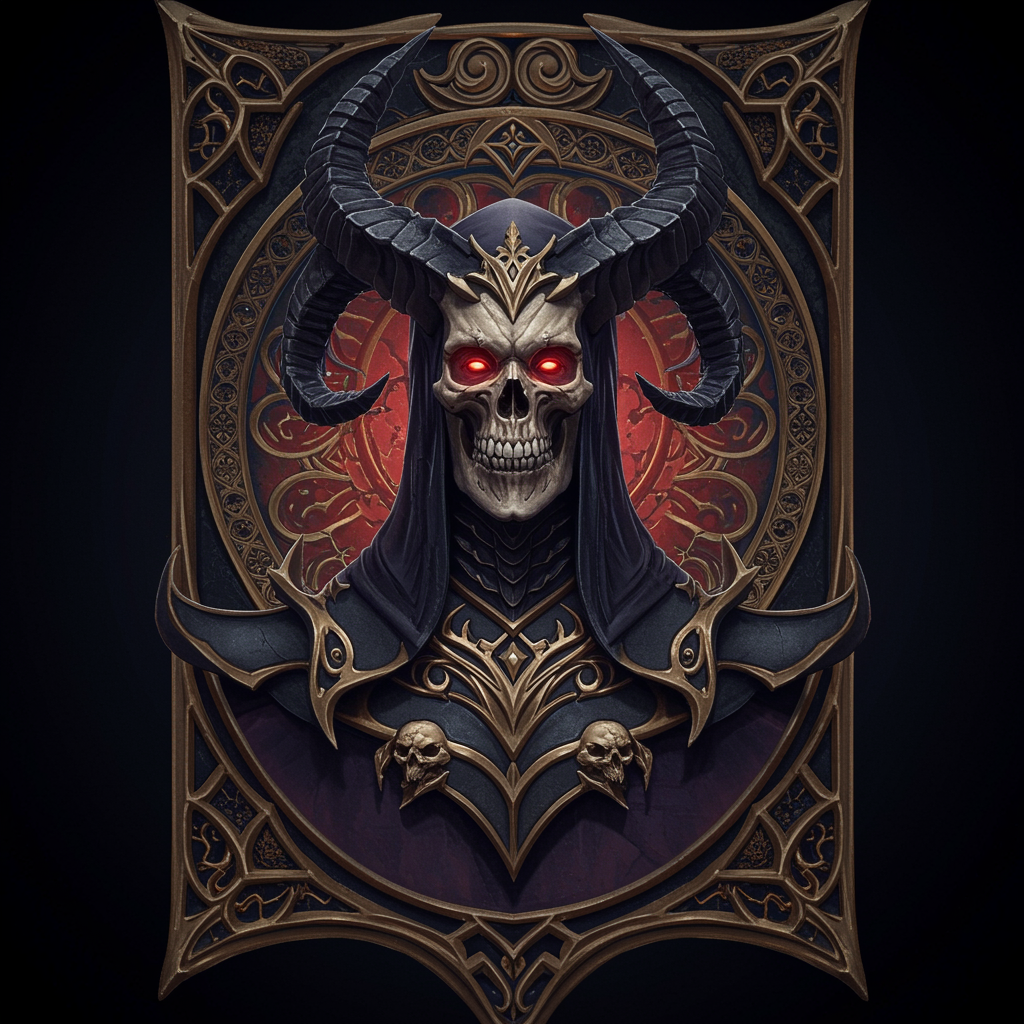 Skull demon sorcerer concept art portrait featuring intricate gothic details by Terese Nielsen, Brom, Miho Hirano, hyperdetailed and trending on Artstation. The artwork employs triadic colors and utilizes Unreal Engine 5 for a detailed matte painting. Set against a dark black background and inspired by art nouveau, the piece showcases deep, fantastical colors with intricate details. Designed as a splash screen, it uses complementary colors and stands as a fantasy concept art masterpiece reminiscent of gothic deviantart styles. Encased in an ornate border, the image boasts vivid colors, rendered in 16k resolution with UHD and HDR10 quality. The composition captures the ornate and fantastical with some creative adjustments for uniqueness, ensuring no low quality aspects like disfigurement, mutations, blurs, or other artifacts disrupt the high-definition experience.