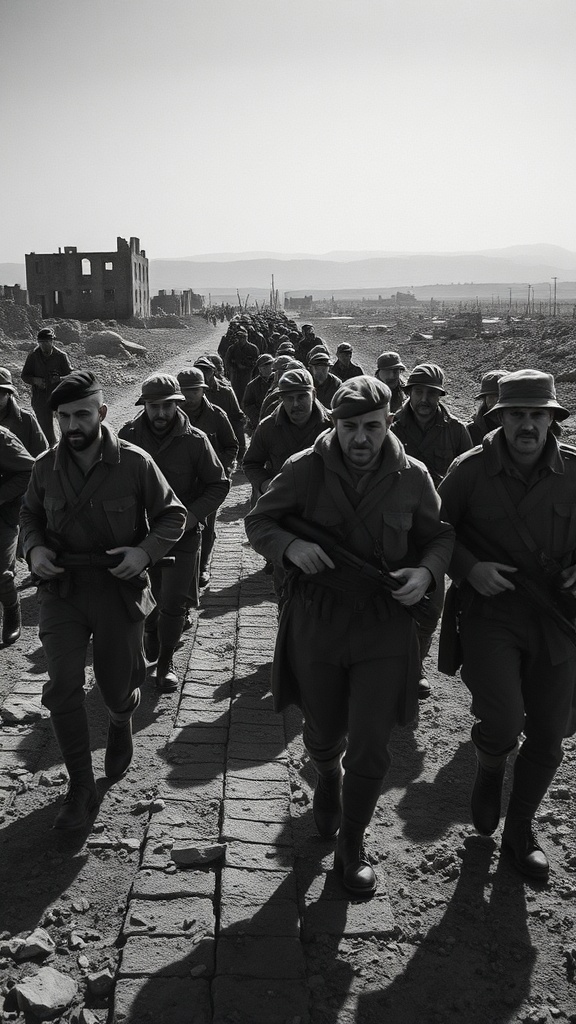 View this AI-generated image featuring a band of valiant soldiers clad in rugged uniforms traverse a desolate war torn landscape the air heavy with tension and determination shadows stretch long across the battlefield accentuating the stark monochromatic contrast of their unwavering resolve against