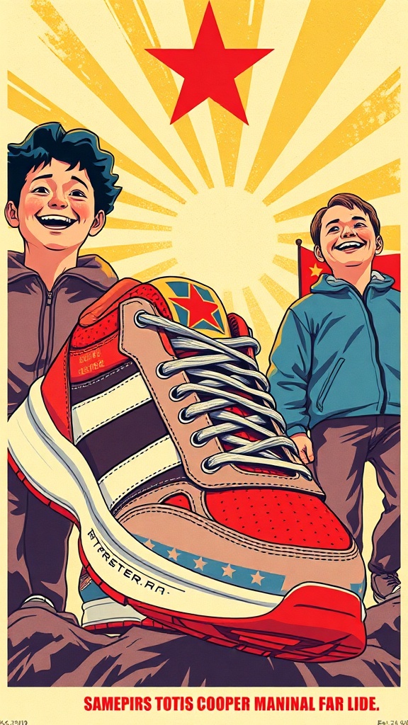 View this AI-generated image featuring soviet inspired sneaker design poster featuring bold lines and vivid colors capturing the essence of ussr propaganda style with an anime twist showcasing high detail artwork with the appearance of offset printing the poster features happy figures in natural lig