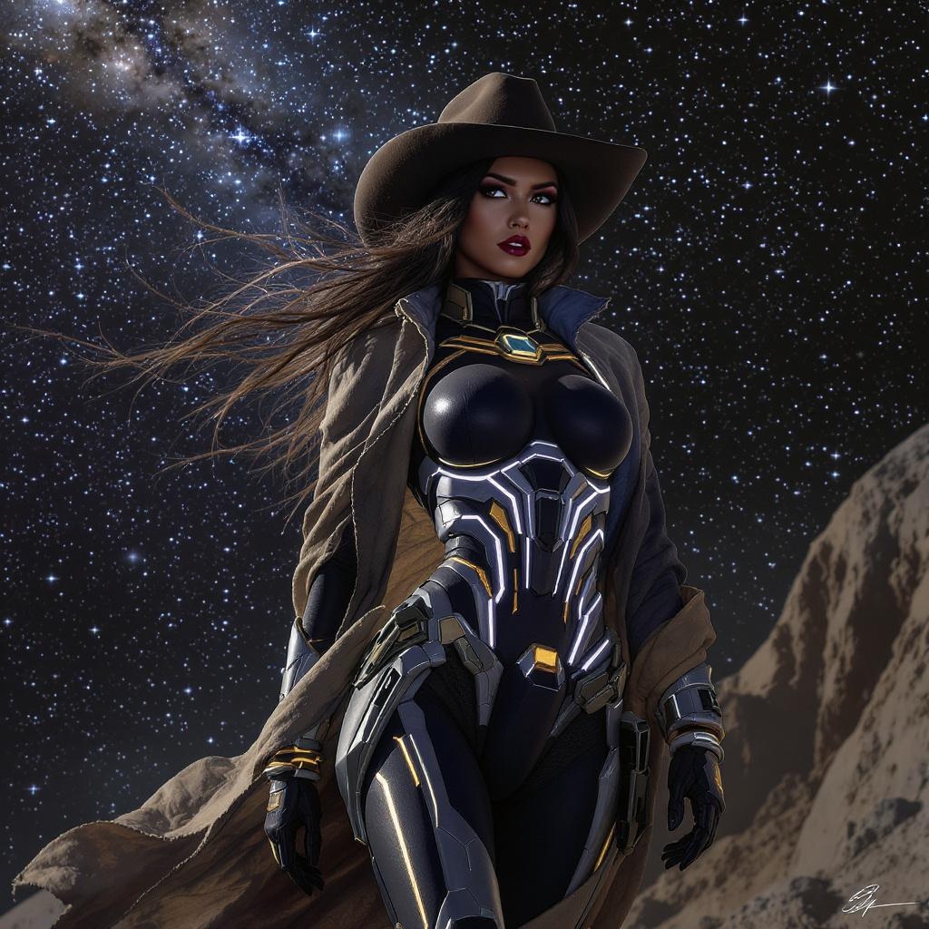 A confident and adventurous Space Cowgirl journeys through the cosmos, her spirit as untamed as the galaxies she explores. She embodies a unique blend of styles, wearing a weathered duster that flutters theatrically in the endless void. The ensemble is completed by a well-worn, wide-brimmed hat, artfully tilted to cloak her keen, penetrating eyes. Her look is further enhanced by a cutting-edge gundam armor that exudes elegance, with luminous accents tracing the contours of her suit. This futuristic mech-inspired bodysuit is a seamless fusion of tradition and innovation, capturing the essence of a trailblazer whose heart beats in harmony with the rhythm of the stars.