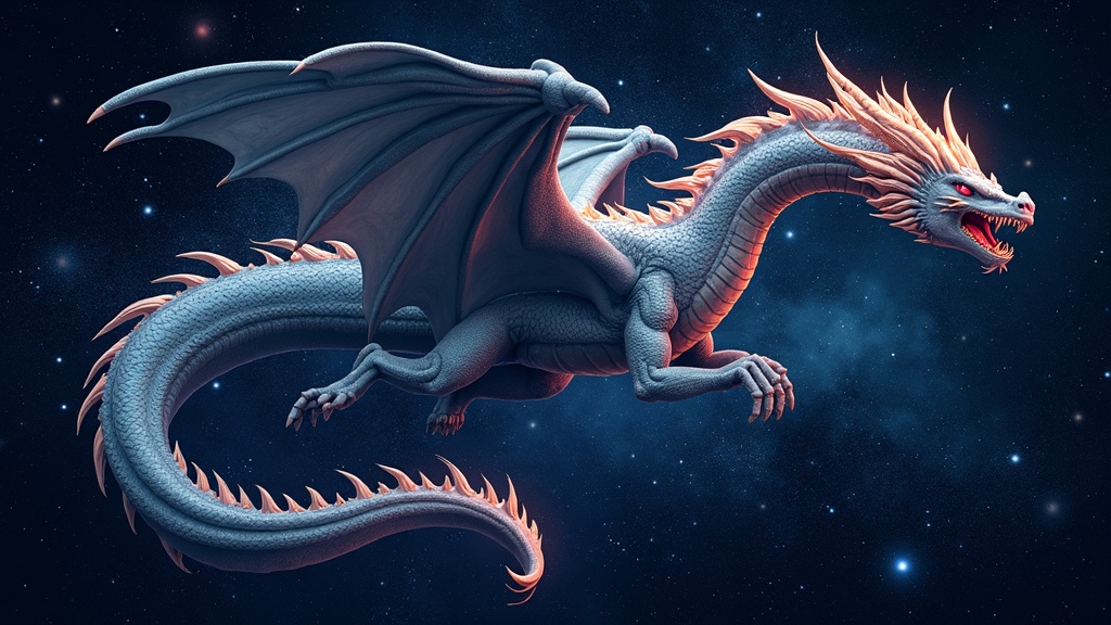 View this AI-generated image featuring a massive space faring dragon reminiscent of aurelion sol adorned with scales that shimmer under the deep starlight of the cosmos weaves through the zodiac constellations in a mesmerizing spiral of movement its immense form glides gracefully capturing the mysti