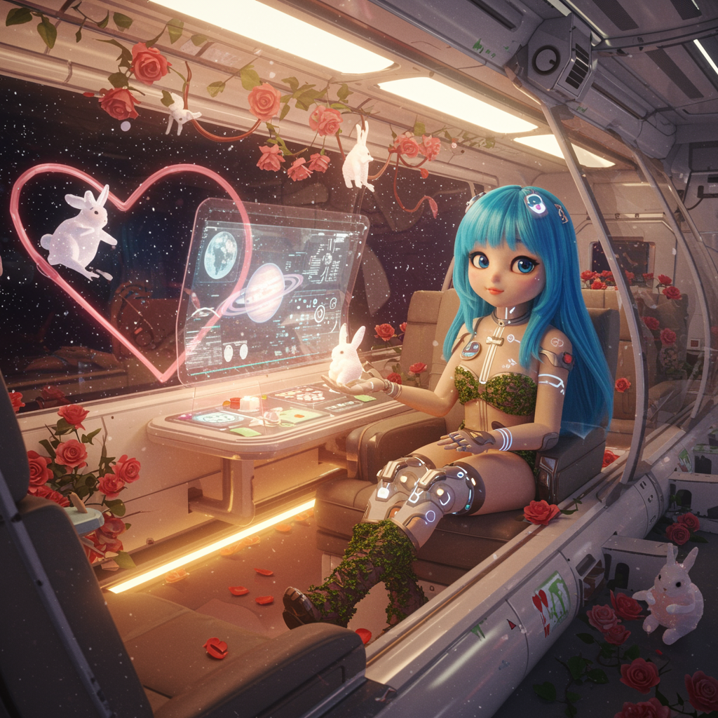 A radiant spacecraft with heart-shaped decorations and roses adorning its sleek, transparent walls glides through the galaxy. Inside, a holographic display flickers with images of far-off planets and alien landscapes. Cybernetic implants glint subtly on the passengers, enhancing their experience as they revel in the warm, romantic ambiance. Playful rabbits hop around, adding a touch of whimsy to the unobstructed view of stars. In this cozy, advanced technological haven, an adorable girl with striking blue hair stands out. Her presence is cinematic under soft, radiant lighting, reminiscent of 8k resolution captured on 35mm f1.4 Fuji color film. Clothed in attire that harmoniously blends nature with technology, without the confines of a space uniform, she embodies hyper-realistic beauty in this futuristic setting.