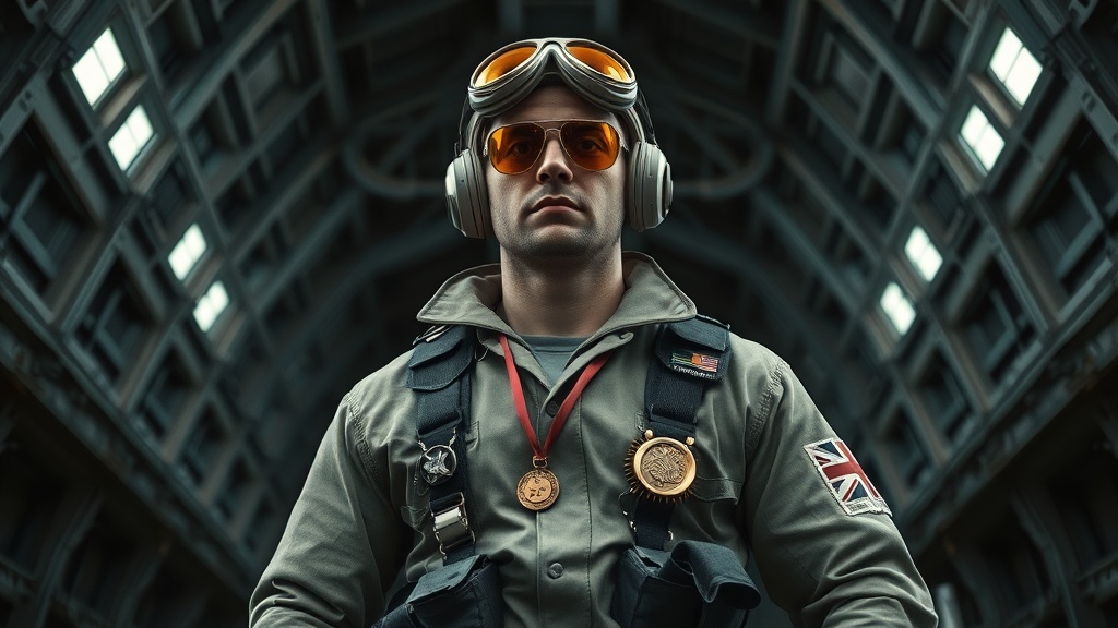 spaceship hangar, confident male engineer, elaborately detailed Olive Fresh Nickel silver cloth uniform, sci-fi, futuristic, steampunk elements, adorned with medals, equipped with a utility belt, striking cinematic lighting, low angle perspective, active dynamic stance, proportional scale, golden aviator sunglasses, highly detailed face, artwork of high caliber, 8k resolution, shadowy atmosphere, assortment of tools, realistic texture of fabric with natural folds, uninteresting backdrop, monochrome palette with minimal contrast, background texture, protective helmet with hard surfaces, national flag featuring stars and stripes alongside union jack, focus on craftsmanship and modesty, sans unnecessary nudity or exaggerated forms.