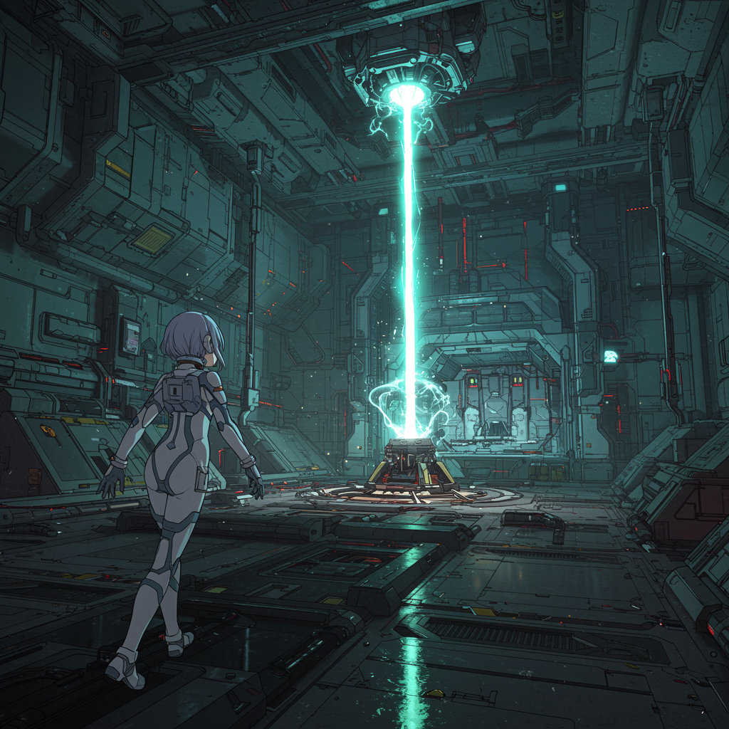 A girl in a futuristic spacesuit navigates the interior of a massive spaceship, reminiscent of Tsutomu Nihei's architectural style from Sidonia no Kishi. The environment exhibits a sense of gigantism, with towering walls and multi-layered platforms. In the center, a powerful laser generator emits beams of energy, creating dynamic shadows and vibrant reflections. Above, a captivating laser descends from the sky, interacting with swirling energy clots. The scene is alive with acceleration and the brilliant flash of light, evoking a sense of speed and urgency. Rendered with anime-influenced hyperdetail, the artwork captures the essence of manga graphics in stunning 8K resolution, offering a high-definition, first-person perspective that immerses the viewer in this expansive, sci-fi universe.