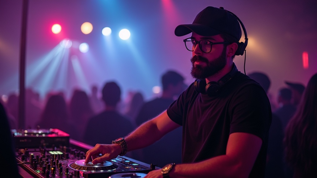 A bearded DJ sporting stylish glasses, a baseball cap, and a sleek black T-shirt spins tracks at a lively nightclub party, surrounded by swirling cinematic lights and an electrified atmosphere.