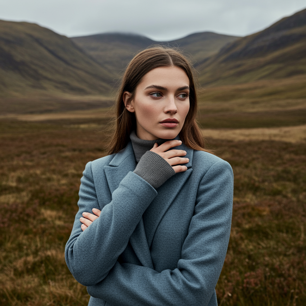 A woman standing gracefully in a sprawling field, exuding an aura of effortless sophistication in the style of an outdoor fashion shoot. Natural light bathes the scenery, highlighting her features against the backdrop of majestic Scottish landscapes. She wears a palette of rich light navy and deep brown, echoing the subtle elegance of Georg Jensen's designs. The camera, a Sony A7III, captures intense close-ups that reveal the intricate details of her expression and attire, creating an immersive, storytelling visual narrative. The aspect ratio, slightly altered to enhance the visual drama, frames her within the wild beauty of the open terrain.