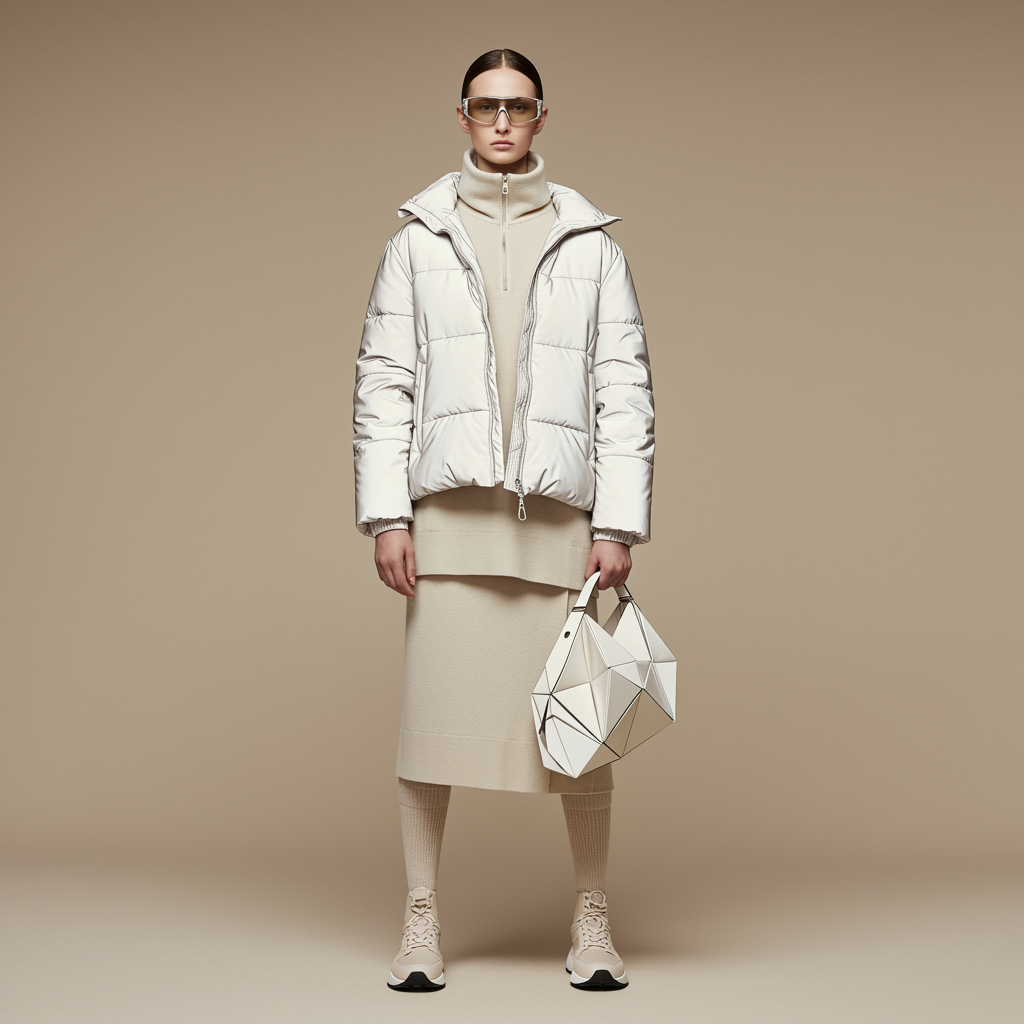 The woman in the image stands confidently against a neutral beige backdrop, embodying a quintessential Tumblr persona. She sports a chic ensemble featuring a reflective puffer jacket layered beneath a trendy poncho, both rendered in an elegant off-white palette. This outfit seems to cleverly nod to a viral internet trend or meme that’s capturing attention, currently spotlighted on the influential design site Dezeen. The photograph seems to be from a futuristic fashion catalog, heralding the style forecasts for 2024. Her accessories include an ultra-modern mac, sleek 8.0 LV sunglasses, and a meticulously folded piece by renowned designers Mike and Wojtek Fus. This ensemble encapsulates the avant-garde fashion ethos of the moment, poised to captivate and leave a lasting impression.