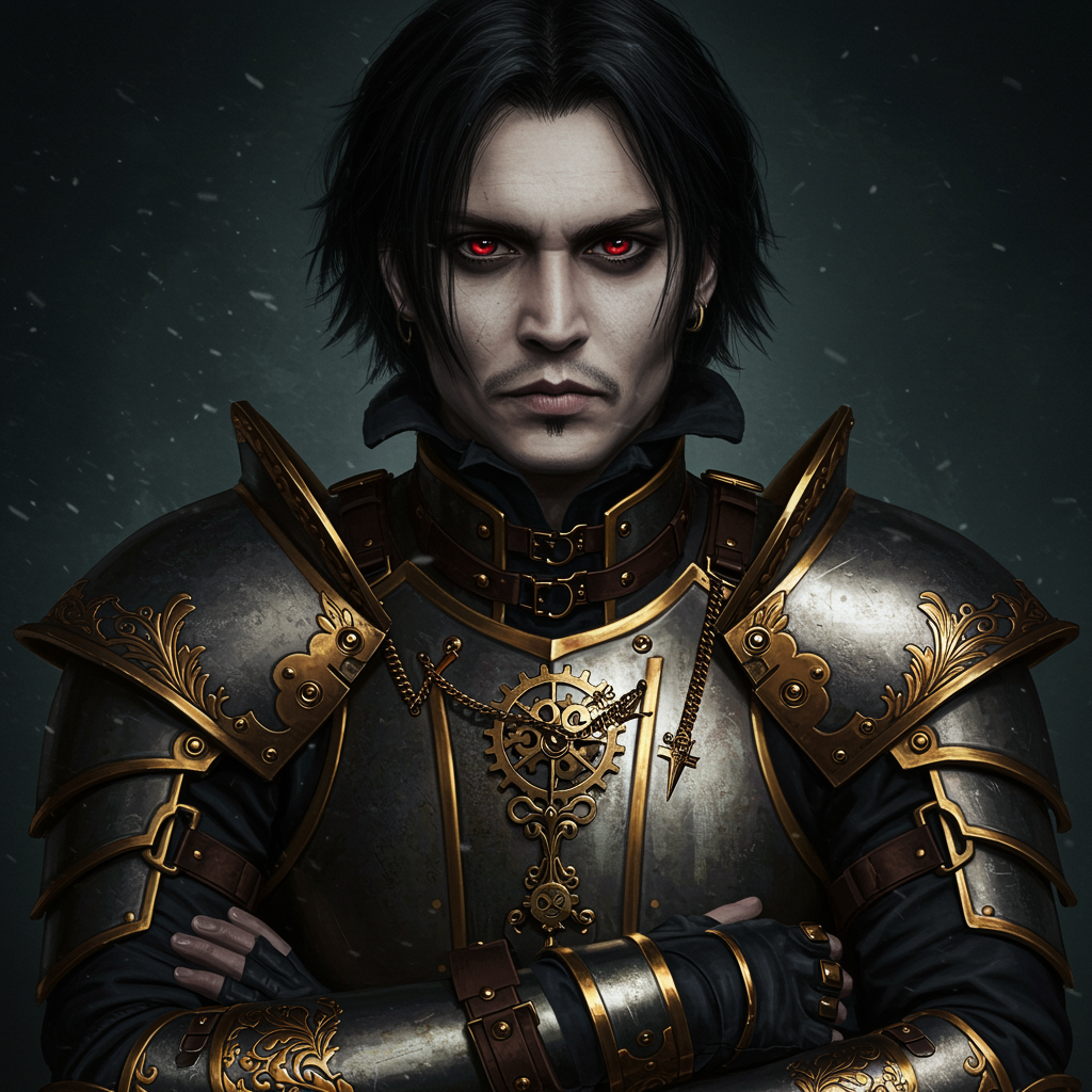Steampunk inspiration featuring a character with striking red eyes and sleek black hair, reminiscent of a young Johnny Depp with a perfectly symmetrical face. The scene is captured in an extremely detailed, ultra HD, 8k cinematic shot with dramatic studio portrait lighting that illuminates the face subtly. This full-body portrayal showcases intricate steampunk armor, exuding a sense of adventure and mystery. The composition highlights the character's enigmatic aura without any distractions or imperfections, ensuring a captivating visual. The atmosphere is one of intrigue, drawing the viewer into a world where past and future collide in a harmonious blend of fashion and fantasy.