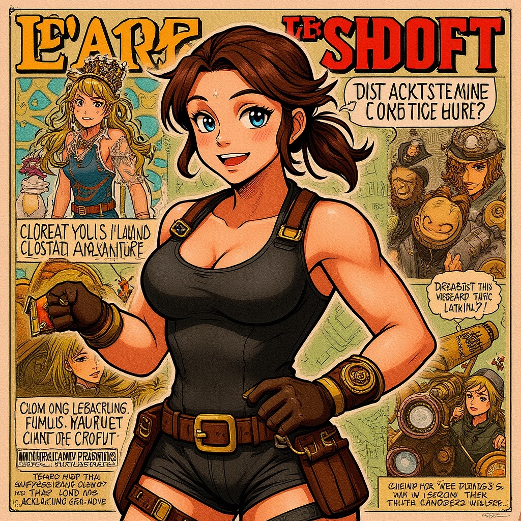 View this AI-generated image featuring steampunk render of lara croft intricately detailed and styled in a comic fashion reminiscent of jim lee with a blend of 3d cartoon and anime elements the portrait features a vibrant collage of sketches that highlight her adventurous spirit and iconic features