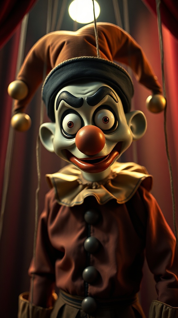 View this AI-generated image featuring a cinematic still portrait of a jester puppet with playful mocking eyes filmed by tim burton the puppet wears a classic fool s outfit with a cap n bells hat standing on a puppet theater stage the scene captures a close up portrait with dramatic lighting shot us