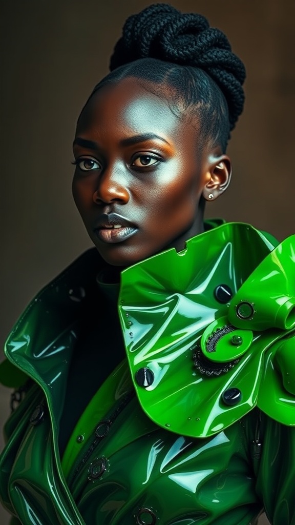 View this AI-generated image featuring striking black female model gazes thoughtfully adorned in avant garde attire featuring luxurious plastic and latex fabrics with dynamic abstract forms and asymmetric high tech embellishments the ensemble is dominated by vibrant green hues reminiscent of iris va