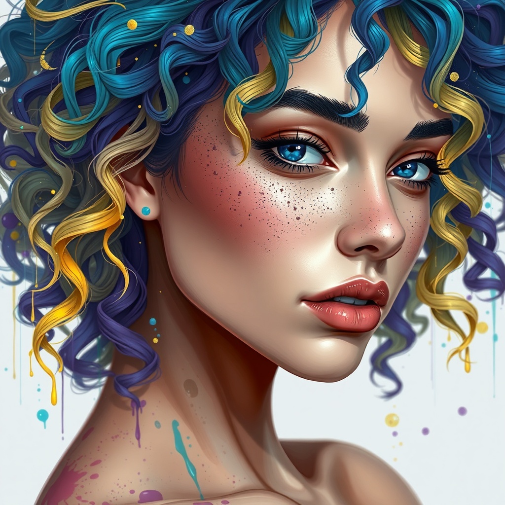 View this AI-generated image featuring stunning half body portrait of a captivating woman with an ombre style of blue yellow green and purple curly hair exquisitely detailed with a cascade of paint splashes and splatters her skin is intricately depicted showcasing natural pores and subtle shading re