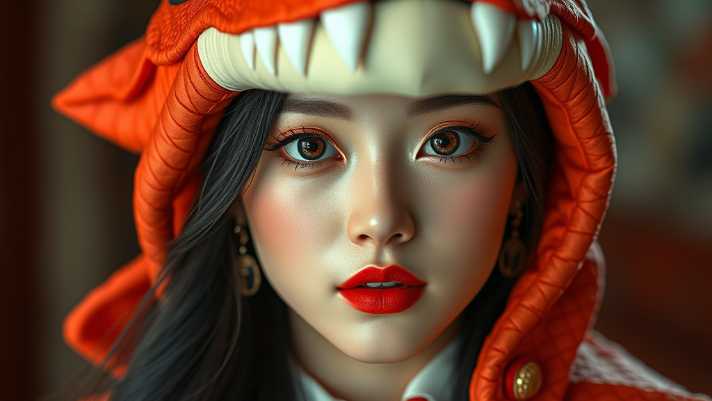 Stunning Korean woman, resembling a Kpop idol, donning a whimsical dinosaur costume, featuring perfectly symmetrical eyes, captured in ultra high-resolution photorealism with 8k detail and dramatic lighting. Her soft red lipstick and elegant jewelry add sophistication to the scene. The blend of CGI and 3D elements with doll-like features creates a mesmerizing fusion of realism and fantasy. The image combines elements of cartoon and anime, enhanced with fine illustration and digital painting techniques. Despite its pristine quality, the artwork subtly incorporates textural elements like jpeg artifacts and cropped angles, accented by details like a stylish tie, intricate buttons, and a vibrant red palette.