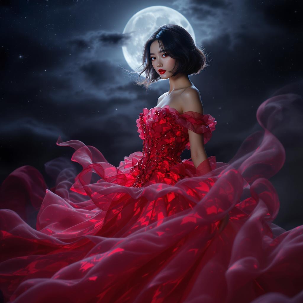 View this AI-generated image featuring stunning korean woman with an enchanting loose bob haircut donned in a mesmerizing flowing gown crafted from ethereal whirls of crimson mist gracefully dancing beneath the silvery glow of the moonlight ultra high resolution photorealistic 8k hyperrealism dramat