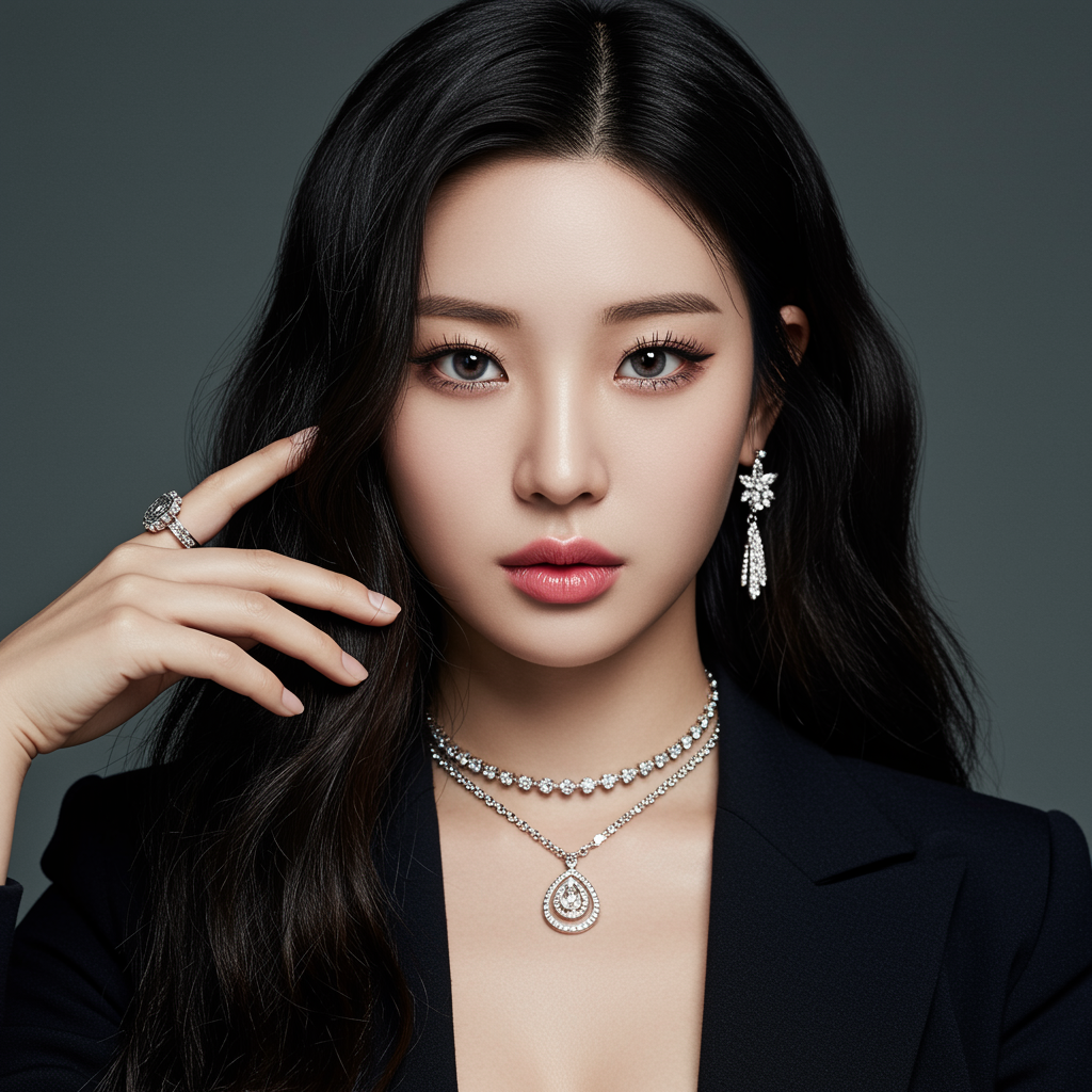 Stunning Korean woman, kpop idol, perfectly symmetrical eyes, ultra-realistic, sharp focus, HD, highly detailed, intricate photography, hyperrealism, vivid studio portrait, dramatic lighting, elegant jewelry, blend of cgi and 3d, reminiscent of a refined doll or anime character, digital art, lowres, text, error-free, intact framing, natural anatomy, well-proportioned features, polished hands and face, balanced proportions, single cohesive figure, precisely depicted limbs, unified and harmonious appearance.