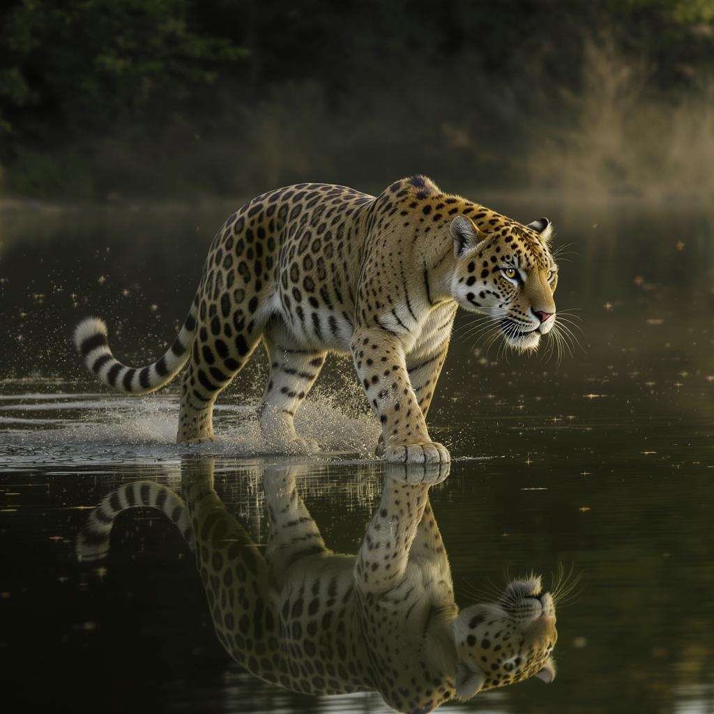 Stunning ultra high resolution official wallpaper of a majestic jaguar gracefully walking across water, observing its reflection with intense focus; award-winning portrait featuring cinematic lighting and a composition based on the golden ratio; showcases elegance and refinement; features unparalleled detail and sharpness in 4k resolution; a true masterpiece crafted with expert skill; enhanced with backlighting and HDR effects for a breathtaking visual experience, capturing the essence of nature's beauty.