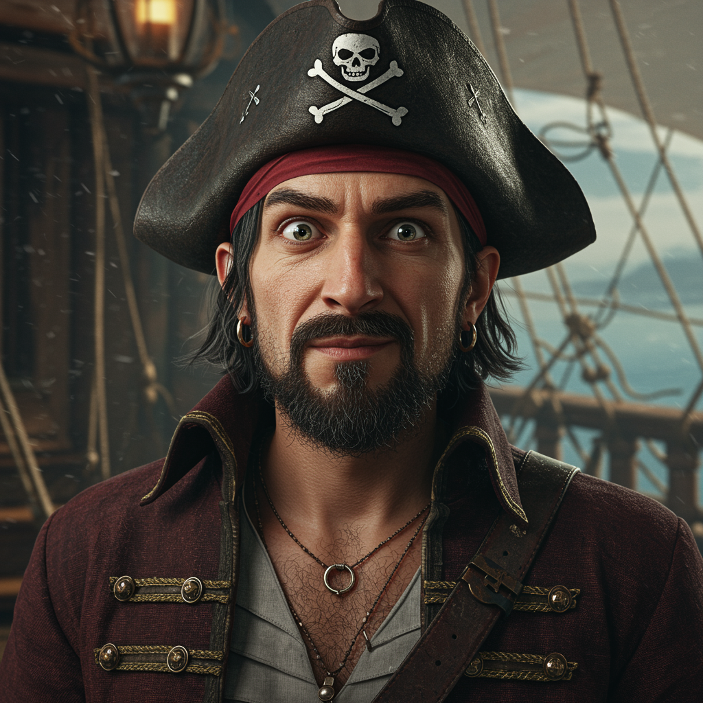 Style of Sam Bosma, space pirate, single man, Jolly Roger hat, steampunk ship, cinematic composition, dramatic lighting, high detail, 16k, UHD, HDR, intriguing eyes, quirky expression, charismatic presence, adventurous spirit, elaborate steampunk attire, dynamic pose, artistic flair, imaginative setting, vibrant colors, whimsical atmosphere, unique perspective, elaborate textures, immersive scene, captivating narrative, atmospheric depth, subtle storytelling elements, intricate mechanical design, atmospheric perspective.