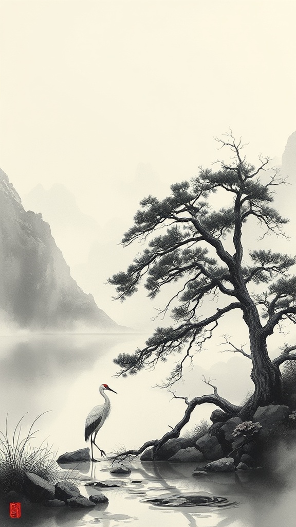 Subtle ink washes shift across the canvas, forming ethereal landscapes of towering mountains and serene lakes under a misty sky. Wisps of clouds drift amidst ancient pine trees, their branches twisted and resilient. Near a tranquil stream, a solitary crane stands, its elegant form reflected in the water, symbolizing grace and longevity. The mood is meditative and timeless, inviting contemplation.