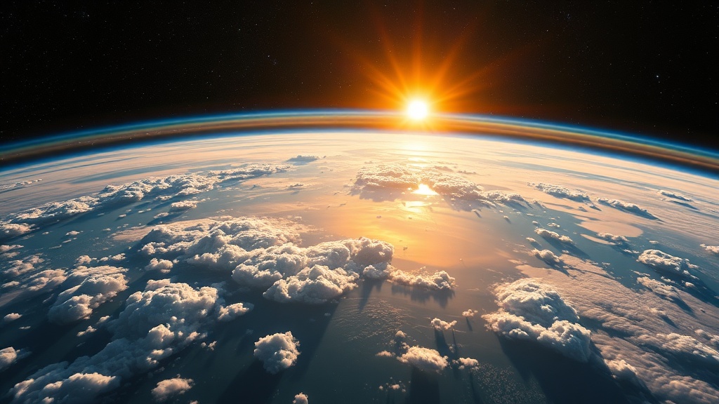 The radiant sun casting a warm glow over the Earth, with vibrant blues and greens of lush continents and swirling clouds in the foreground, set against the vast, starry expanse of space, captured in ultra-high definition detail.