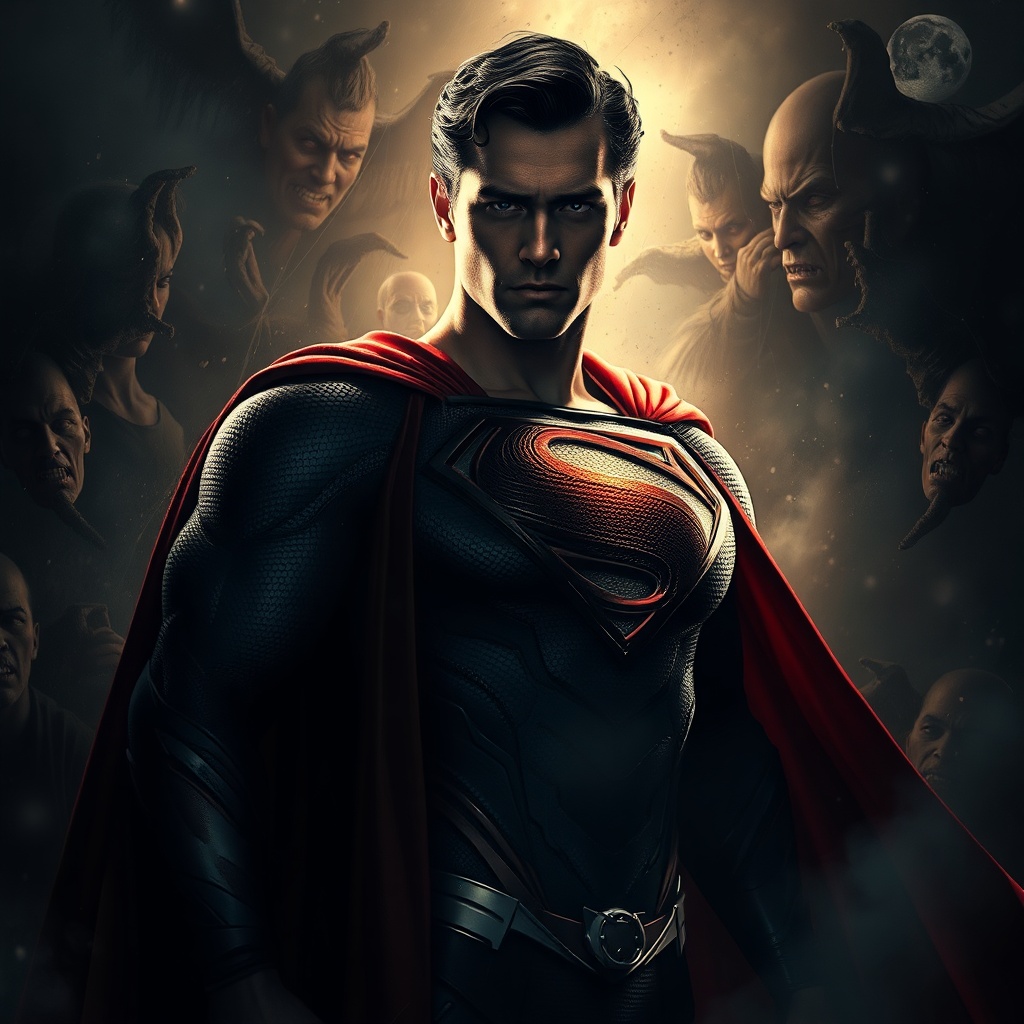 Superman, surrounded by an intense and eerie atmosphere of shadows and dread, illuminated by striking and dramatic light, meticulously detailed with countless subtle elements, hyper realistic in portrayal, capturing the essence of vivid wallpaper portraits, infused with rich and vibrant realism, showcasing an exceptional attention to detail, beautifully colored realism, rendered in ultra-high definition, 8K resolution, evoking a sense of awe and intrigue.