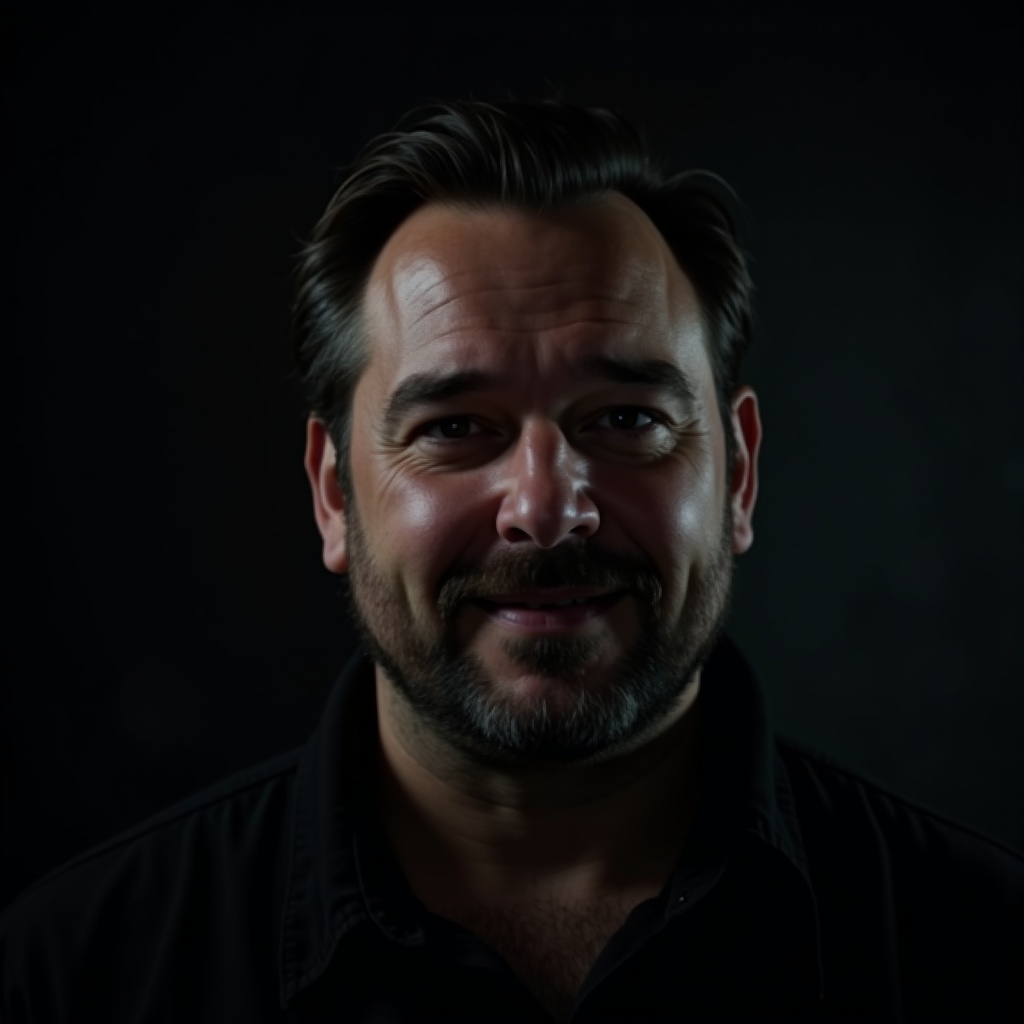 Three-quarter close-up portrait of a stunningly handsome 30-year-old man with an overweight figure and a striking face, exuding a curious and friendly expression. He has a tidy goatee and well-kept hair. The background is oppressive and contrasting, with dramatic backlighting creating an intense atmosphere. The setting conveys a sense of gloom and horror, making the man's friendly demeanor even more pronounced. The scene is captured in a cinematic style from a low angle with a DSLR, using an aperture of f/7, a shutter speed of 1/100 sec, and ISO 150. The image is hyper-detailed and photorealistic, highlighting natural reflections and cinematic lighting. Despite this, the composition remains clear and focused, avoiding any deformations, unnatural proportions, or visual artifacts that would detract from the man's engaging presence.