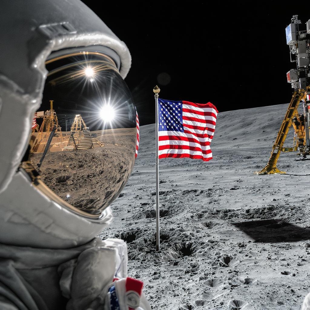 View this AI-generated image featuring through the helmet visor my gaze is focused on the astronaut gloves tightly gripping the pole of the american flag its fabric slowly unfurling in the vacuum of space boot prints disturb the otherwise untouched lunar dust each step a testament to our celestial j