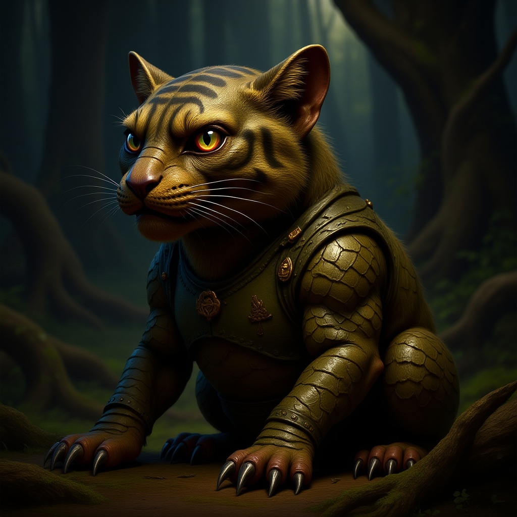 Tigrex in a monster hunter setting, featuring intricately detailed scales and expressive eyes, portrayed in an anatomically accurate manner. The scene is captured in UHD with high detail, utilizing raytracing for vibrant and striking visuals reminiscent of a beautiful masterpiece. The style is akin to a meticulously crafted oil painting. Despite the quality, there are subtle flaws like low resolution, minor anatomical inaccuracies, occasional jpeg artifacts, and areas that appear slightly cropped or blurry. Some elements bear the presence of a signature or watermark, and there are signs of artistic blemishes such as deformed features, missing or extra digits, or limbs rendered imperfectly, contributing to an overall unique and captivating image.