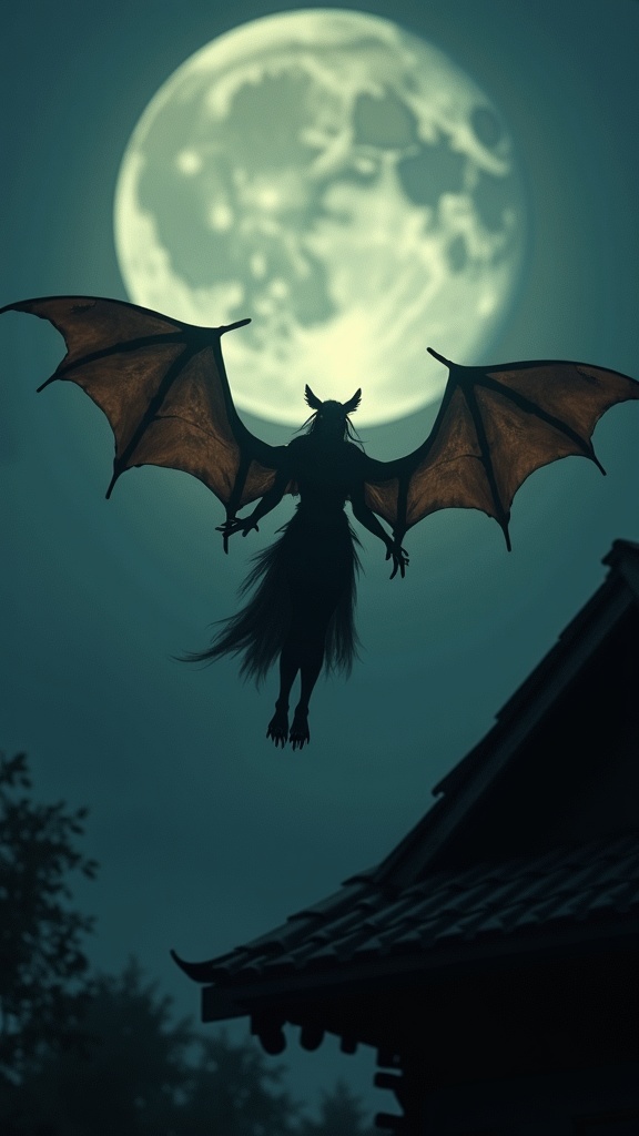 View this AI-generated image featuring a sinister tiktik a female creature from philippine folklore with leathery bat like wings and sharp fangs hovers menacingly near the edge of a house s roof the expansive full moon casts an eerie glow illuminating the scene with a haunting luminescence the atmos