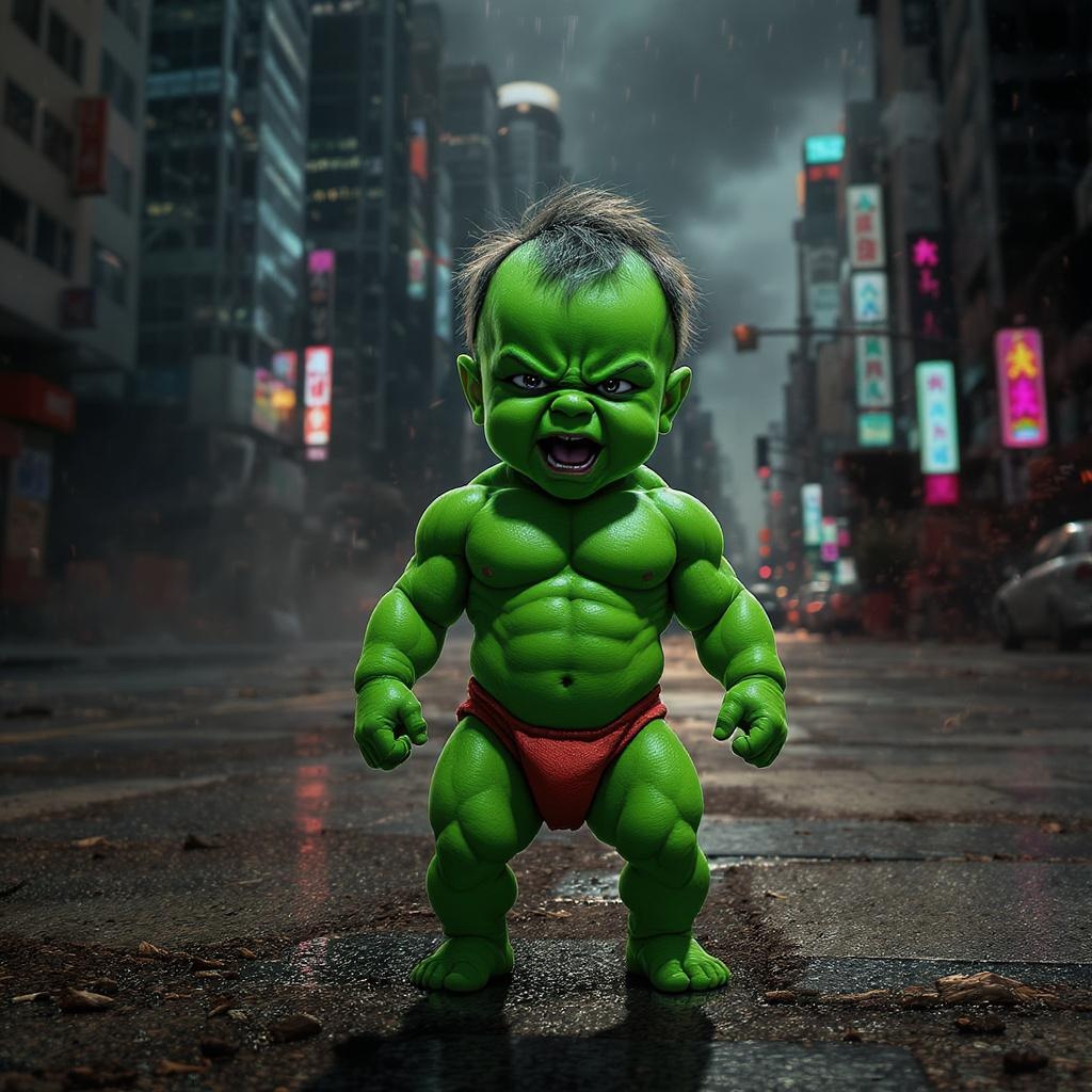 View this AI-generated image featuring tiny muscular green toddler with a playful yet intense expression standing amidst a dramatic cityscape backdrop lights casting dynamic shadows capturing a sense of immense power in a child like form highly detailed and vividly lifelike. Created using advanced A